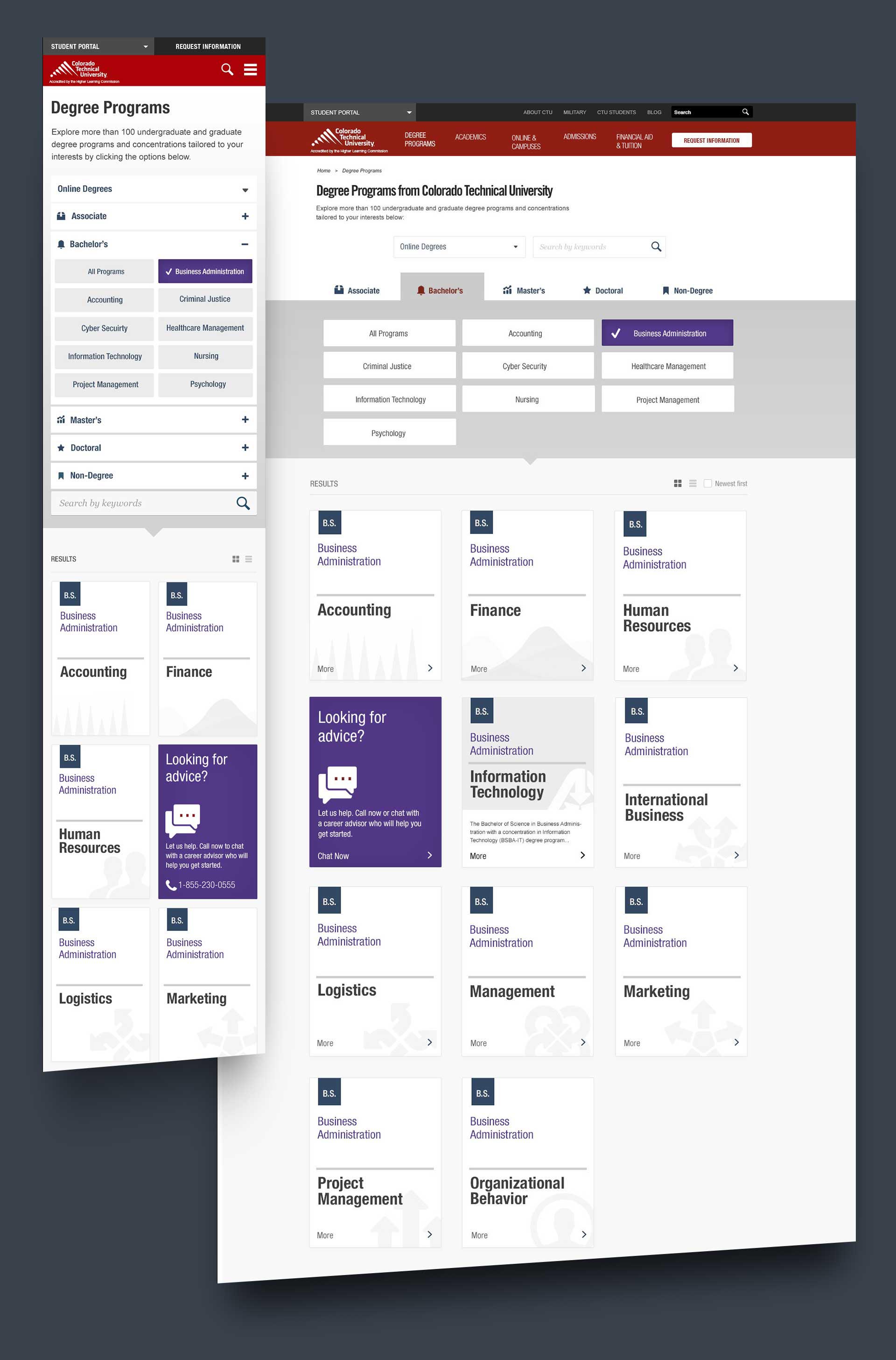 When it comes to responsive transactional experiences, CTU knew that having a strategy partner like Razorfish was essential. The Design and Strategy teams solutioned many phased improvements to their digital course catalog experience including a design system to identify degree programs, courses, and the support programs for students.